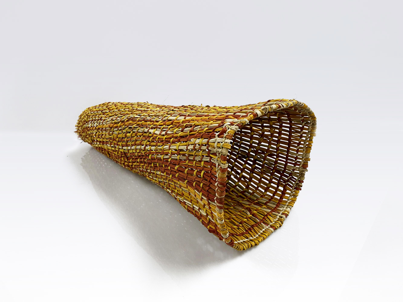 • 8. $550 Evonne Munuyngu - Fish trap, pandanus and natural dyes, 17.8 x 47.4 x 27.1cm