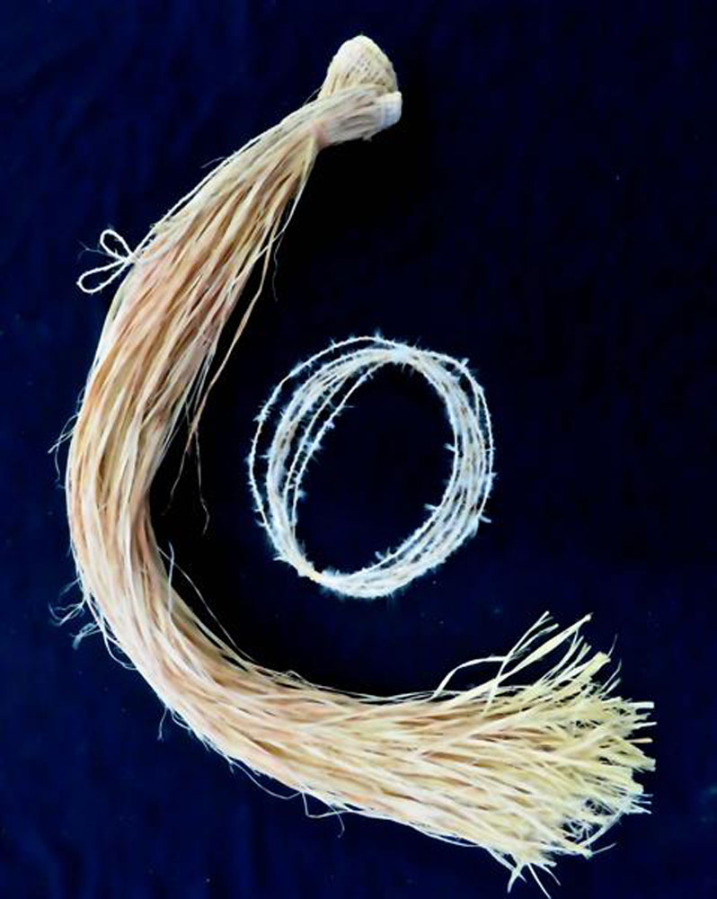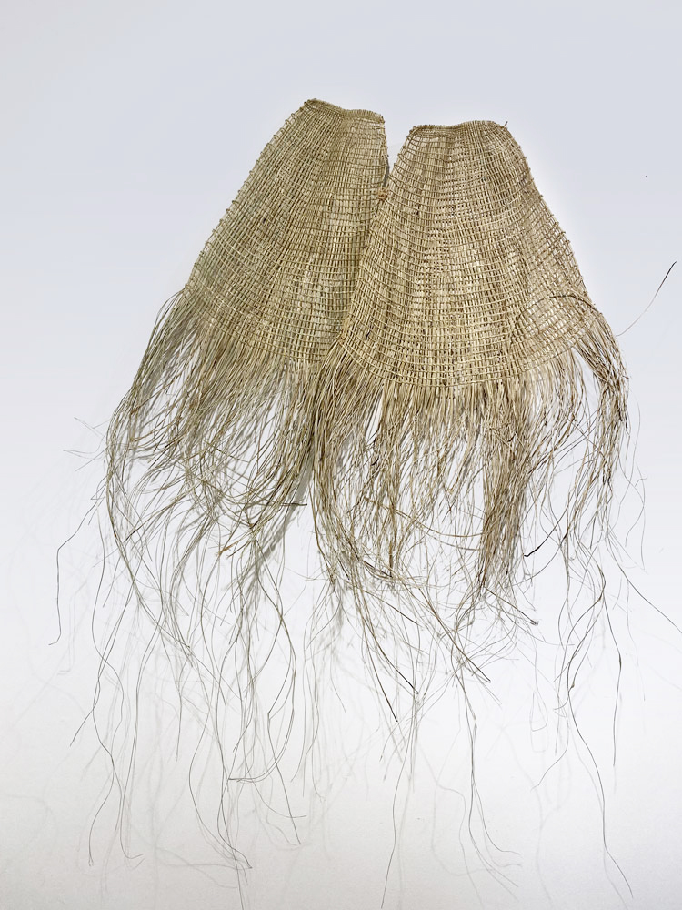 • 14. $480 Margaret Djarrbalabal Malibirr - Dhirrithirri (ceremonial skirt) and Malka (ceremonial headdress), kurrajong and feathers, 93 x 20 x 6.5cm; 23 x 18cm