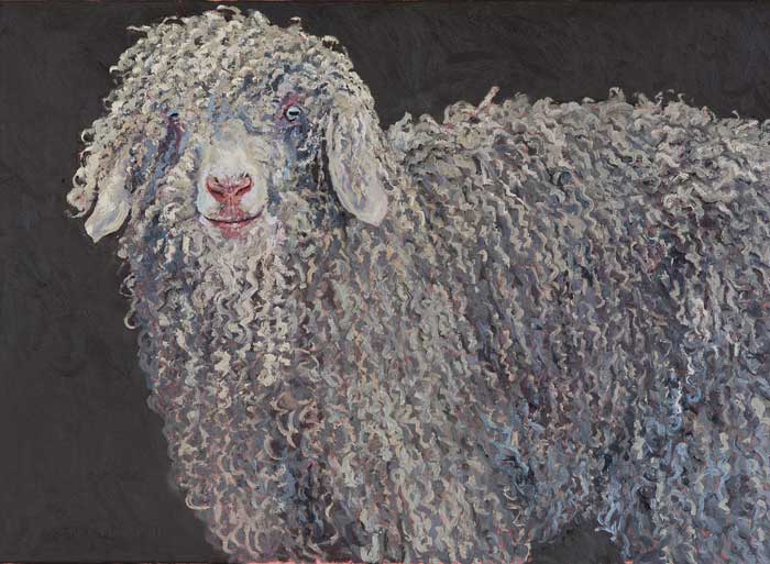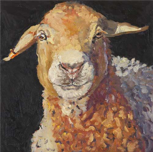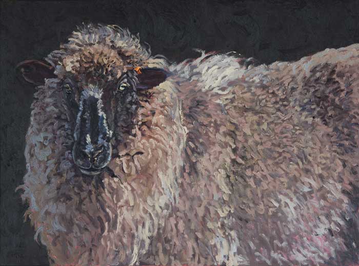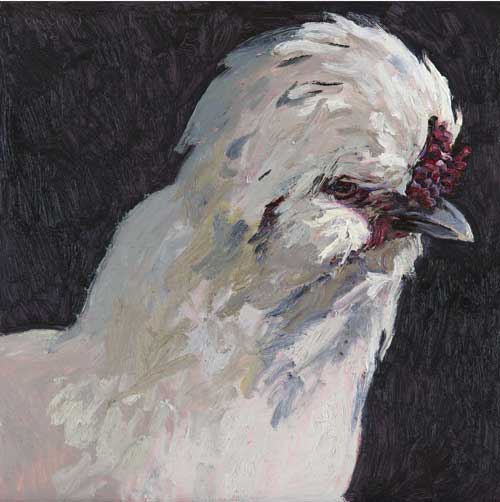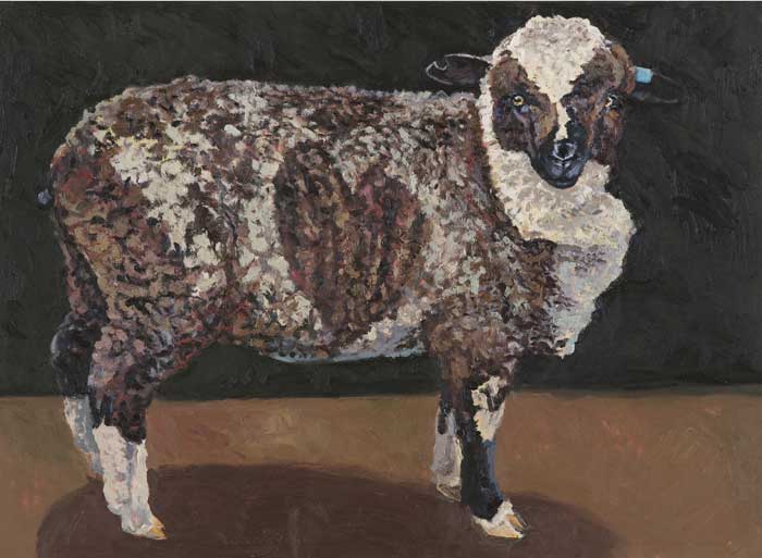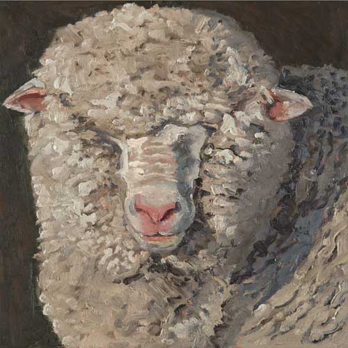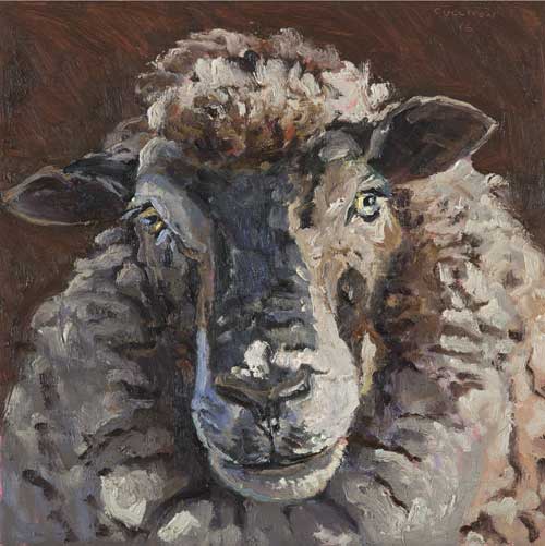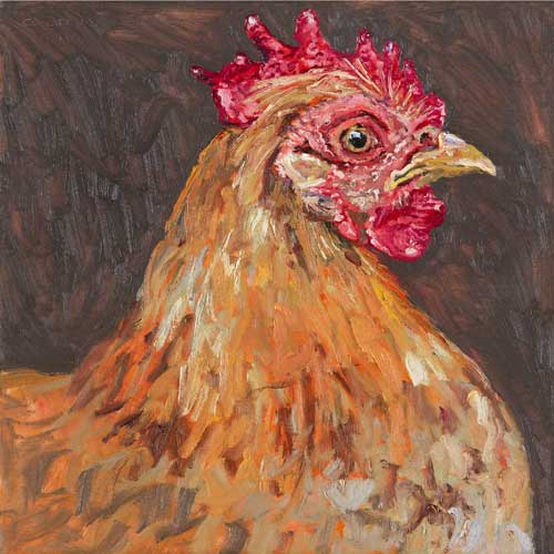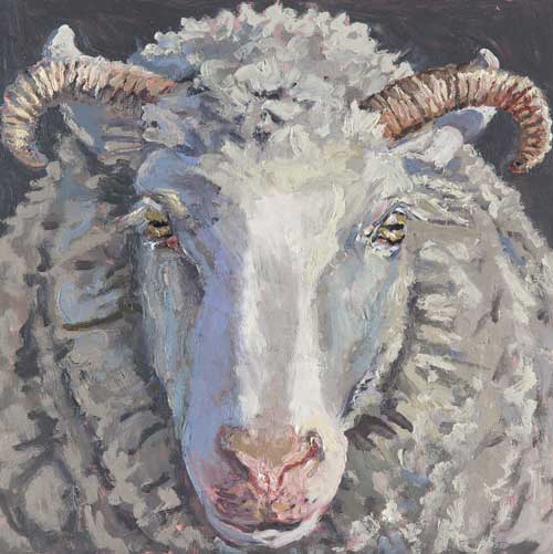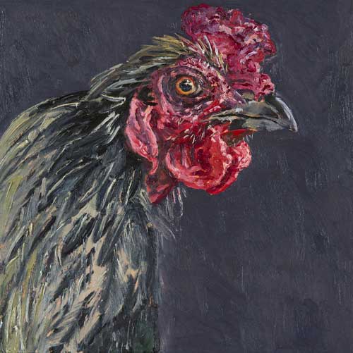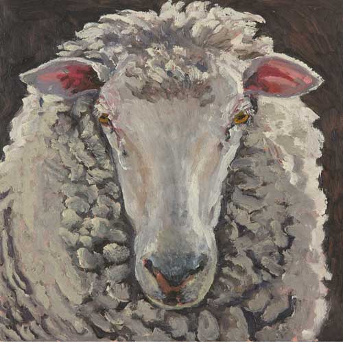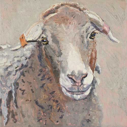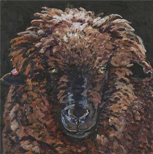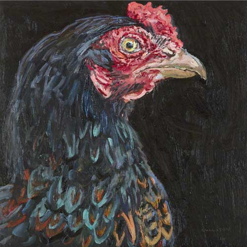Lucy Culliton’s paintings are inspired by country life on her property in the Monaro district of NSW. “I moved down here with 2 dogs, 4 horses, and 11 pigeons. That winter I got 2 poddy lambs from a neighbour which was the start of my ever growing family of rescued and unwanted animals. There are now 42 sheep, 6 horses, 3 cows, a pig, 4 dogs, chooks, ducks, geese, guinea fowl, pigeons, emus and a large aviary which houses 7 old cockys.” It is these animals that have inspired this wonderful exhibition. Lucy’s animals stare back at you, as if defying you to imagine that they represent something more than what they appear to be – a sheep, goat, chook etc. She wants you to see the individuality in her animals, how handsome or beautiful each one is. The works are rich in colour and the surfaces built up with carefully considered textural brushstrokes. An astute observer of the familiar and seemingly insignificant, Lucy offers the viewer an incisive but caring and often quirky view of the world around her. While looking at the exhibition, Lucy asks you to “enjoy my menagerie, go home and give your dog or cat a pat from me.”