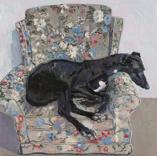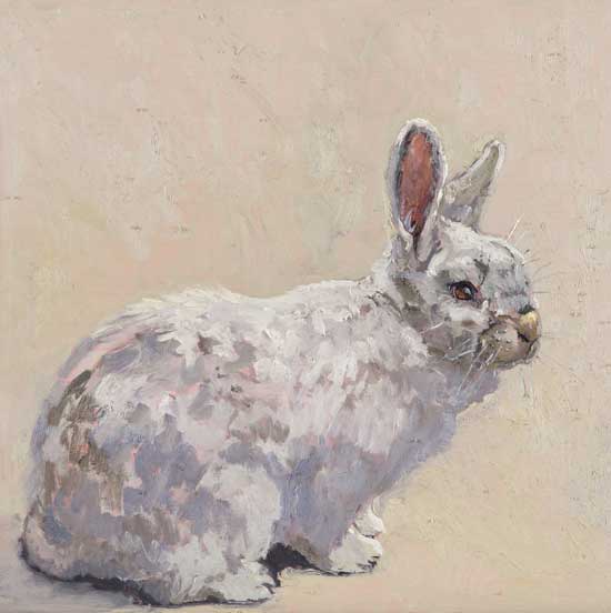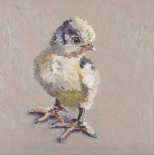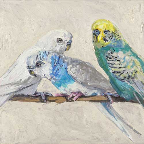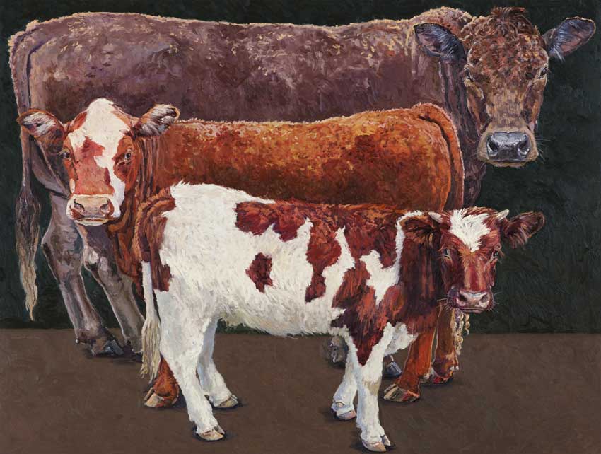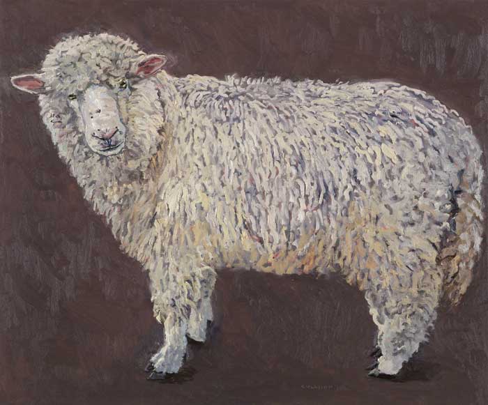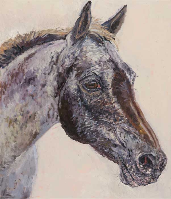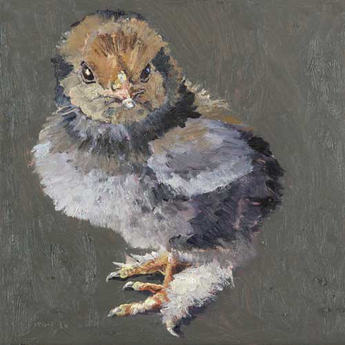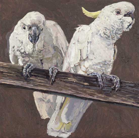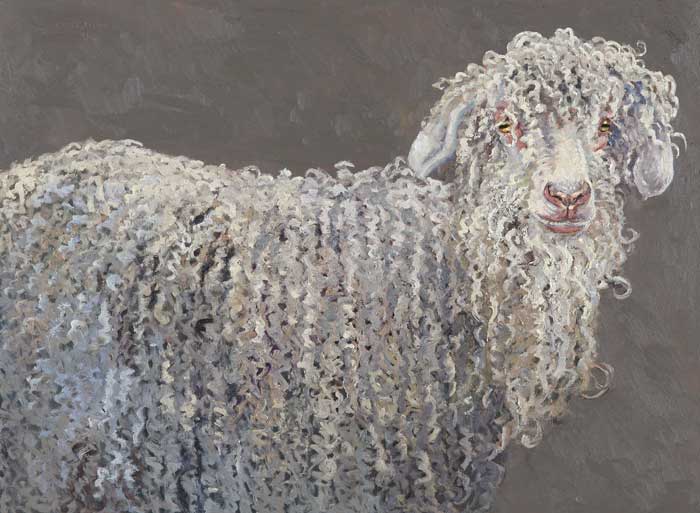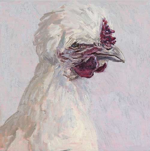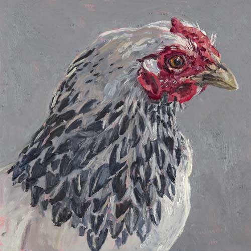 Lucy Culliton’s paintings are inspired by country life on her property in the Monaro district of NSW. “I moved down here with 2 dogs, 4 horses, and 11 pigeons. That winter I got 2 poddy lambs from a neighbour which was the start of my ever growing family of rescued and unwanted animals. There are now 42 sheep, 6 horses, 3 cows, a pig, 4 dogs, chooks, ducks, geese, guinea fowl, pigeons, emus and a large aviary which houses 7 old cockys.” It is these animals that have inspired this wonderful exhibition. Lucy’s animals stare back at you, as if defying you to imagine that they represent something more than what they appear to be – a sheep, goat, chook etc. She wants you to see the individuality in her animals, how handsome or beautiful each one is. The works are rich in colour and the surfaces built up with carefully considered textural brushstrokes. An astute observer of the familiar and seemingly insignificant, Lucy offers the viewer an incisive but caring and often quirky view of the world around her. While looking at the exhibition, Lucy asks you to “enjoy my menagerie, go home and give your dog or cat a pat from me.”