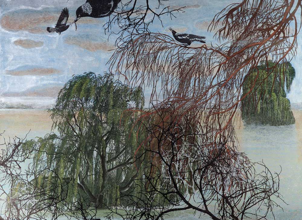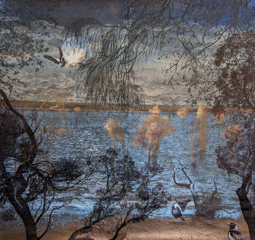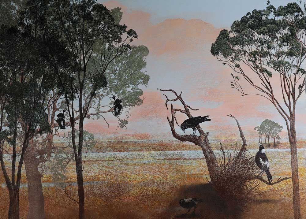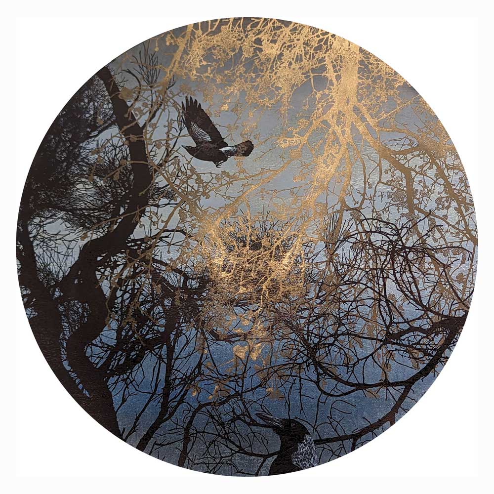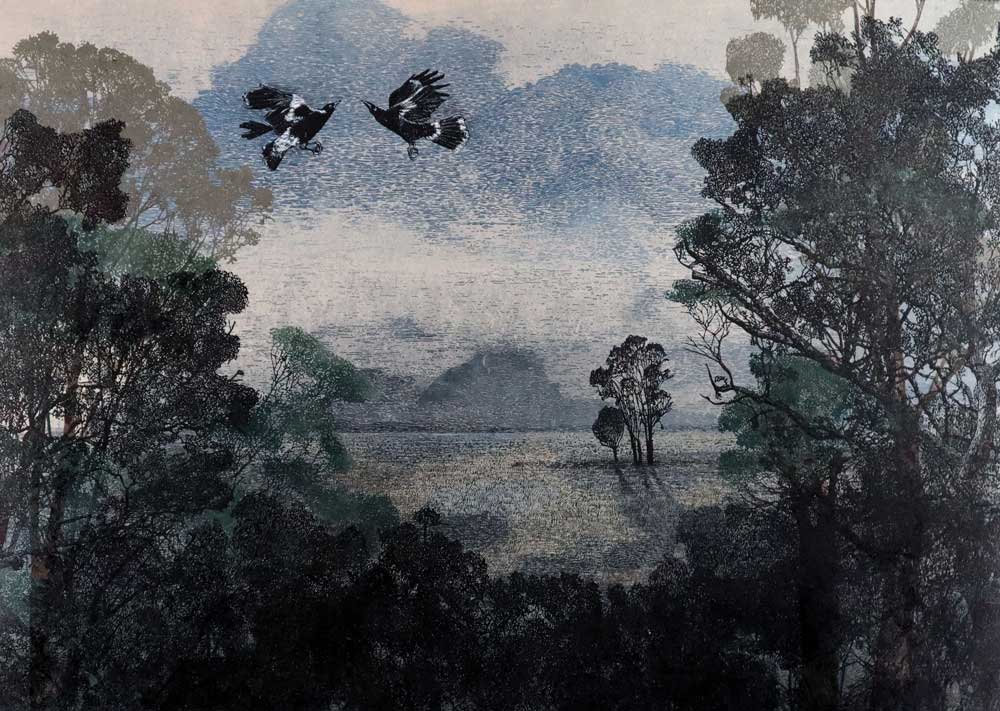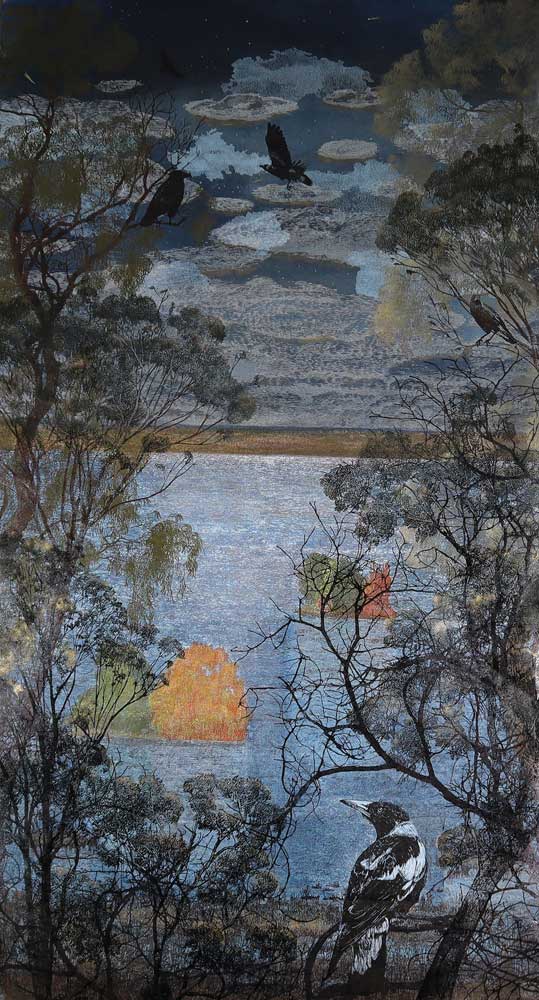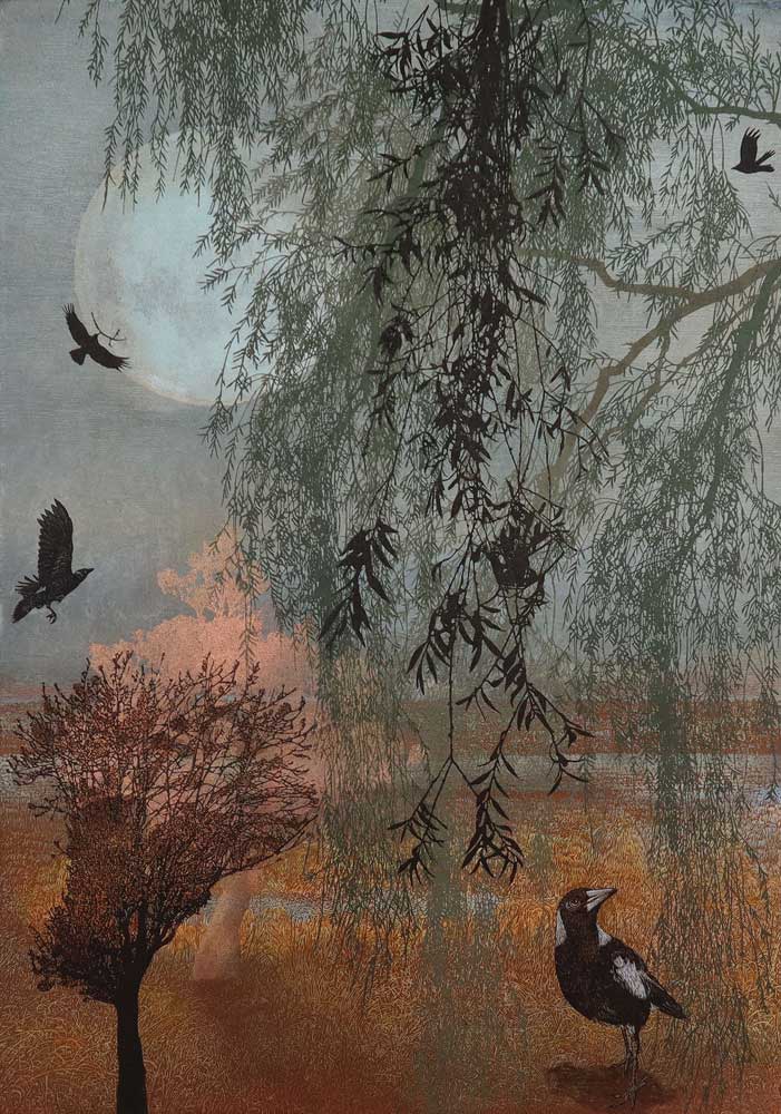 Canberra artist Dianne Fogwell is a highly accomplished printmaker and painter known for her luminous works inspired by the natural world. This exhibition, focusing on the importance of water, follows on from Dianne’s powerful bushfire-themed works over recent years. Inspired by “climatic shifts from fire to flood and ponderings about the significance of water to all life while wandering around the rivers, wetlands and lakes of the Canberra region,” these works capture waters’ regenerative powers of transformation, hope and renewal. Her works on paper, demonstrate her extraordinary relief printmaking skills as she creates dreamscape-like compositions through an intuitive building of layers. Each element of her composition is carefully arranged using a variety of intricately carved individual linocuts of trees and birdlife. These highly detailed images, often combined with soft metallic inks, create glittering luscious surfaces. Dianne’s delicately painted and richly detailed oil paintings, portray the unique characteristics of Canberra’s vibrant bird life. This superb exhibition seeks to draw attention to the intrinsic relationships that nurture our ecosystems whilst simultaneously being mindful of the danger that water can sometimes pose.