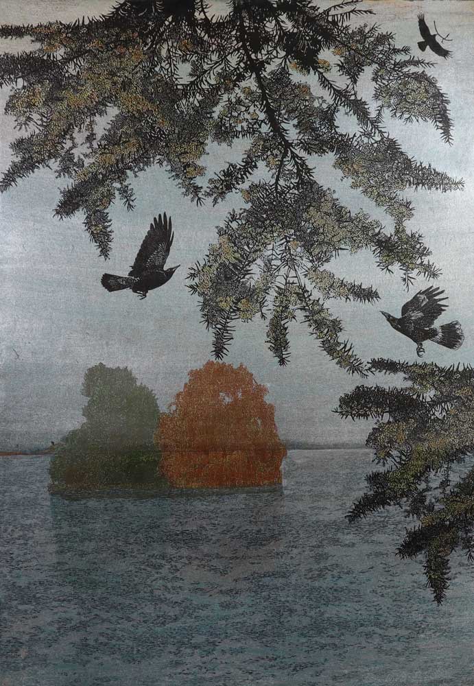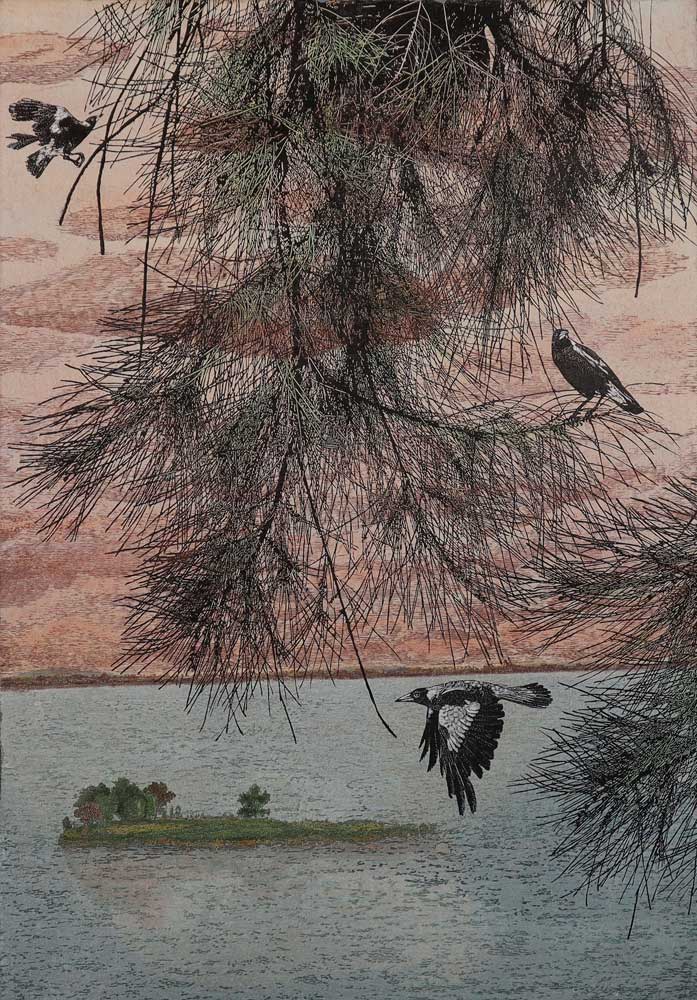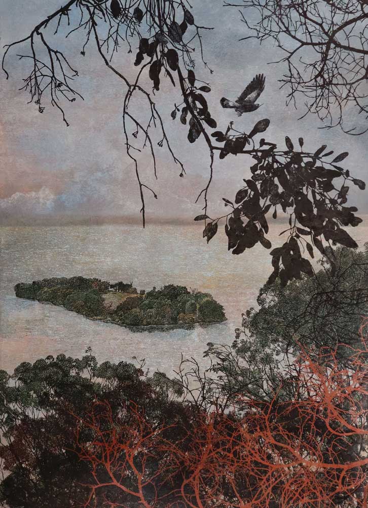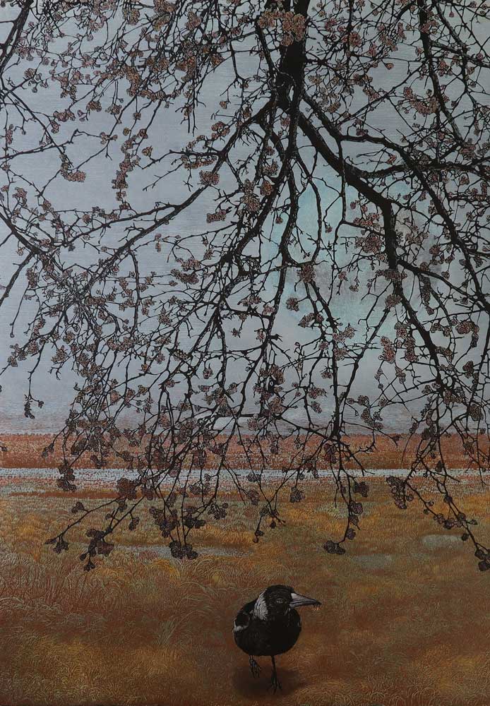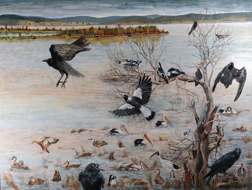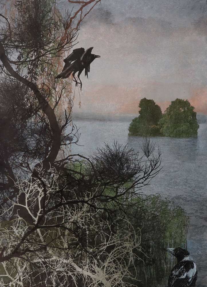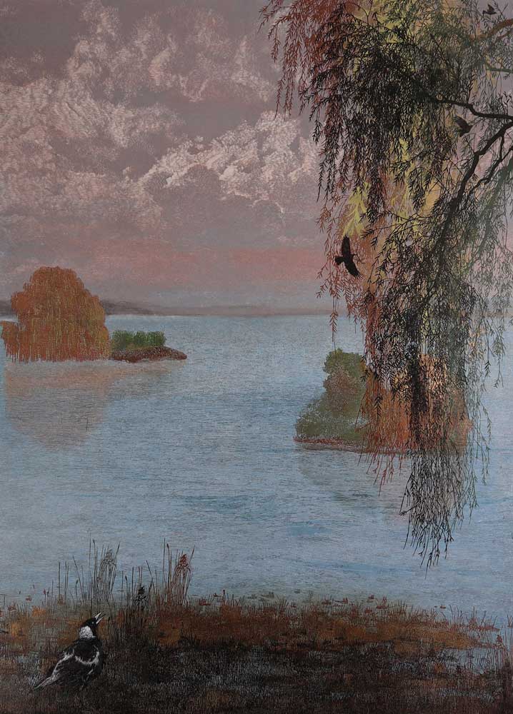 Canberra artist Dianne Fogwell is a highly accomplished printmaker and painter known for her luminous works inspired by the natural world. This exhibition, focusing on the importance of water, follows on from Dianne’s powerful bushfire-themed works over recent years. Inspired by “climatic shifts from fire to flood and ponderings about the significance of water to all life while wandering around the rivers, wetlands and lakes of the Canberra region,” these works capture waters’ regenerative powers of transformation, hope and renewal. Her works on paper, demonstrate her extraordinary relief printmaking skills as she creates dreamscape-like compositions through an intuitive building of layers. Each element of her composition is carefully arranged using a variety of intricately carved individual linocuts of trees and birdlife. These highly detailed images, often combined with soft metallic inks, create glittering luscious surfaces. Dianne’s delicately painted and richly detailed oil paintings, portray the unique characteristics of Canberra’s vibrant bird life. This superb exhibition seeks to draw attention to the intrinsic relationships that nurture our ecosystems whilst simultaneously being mindful of the danger that water can sometimes pose.