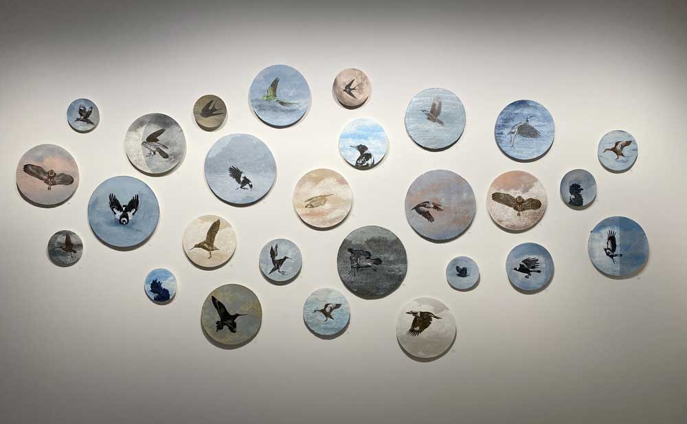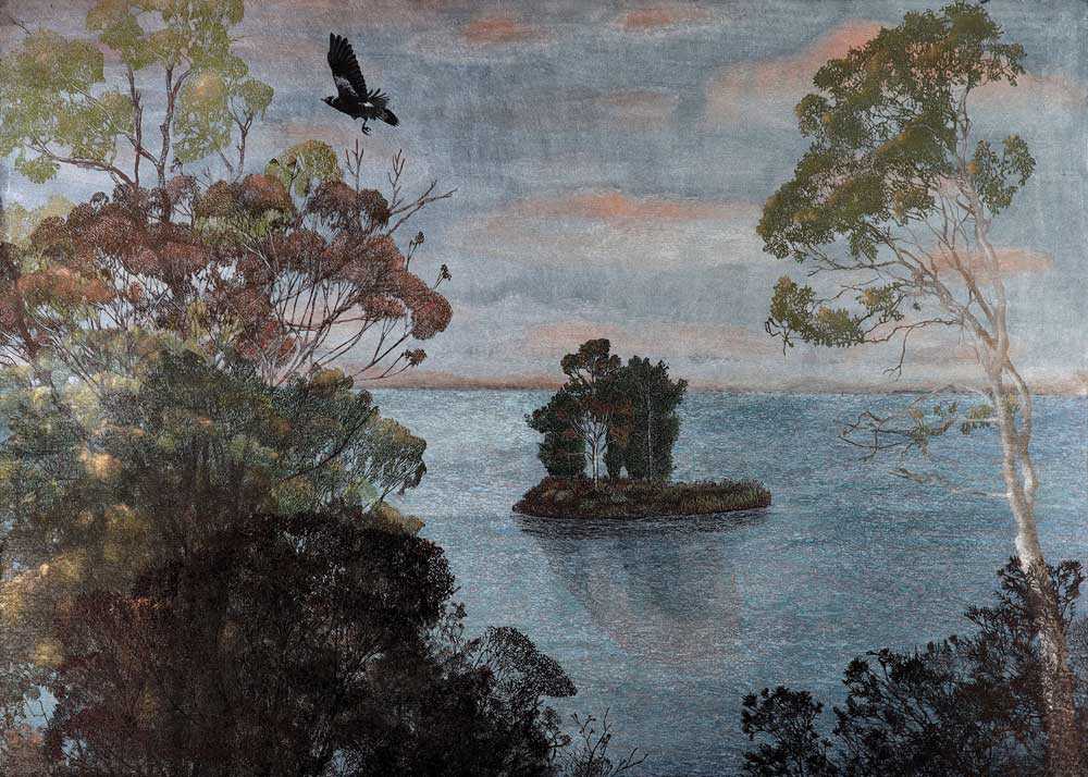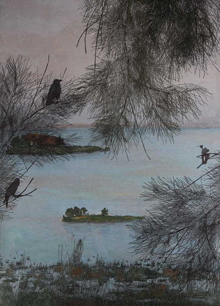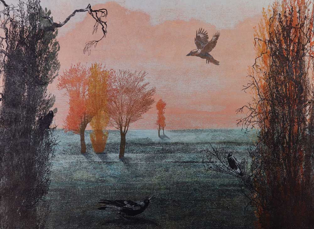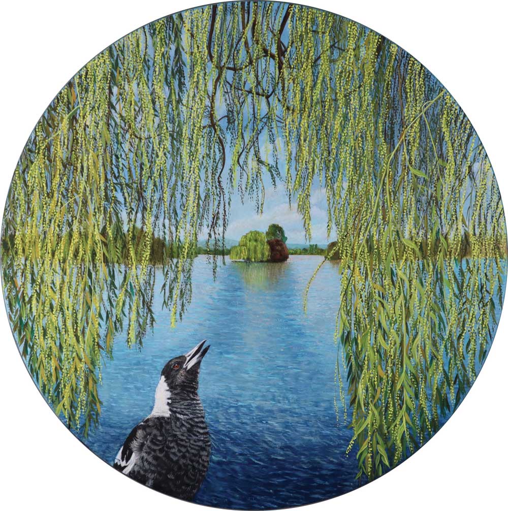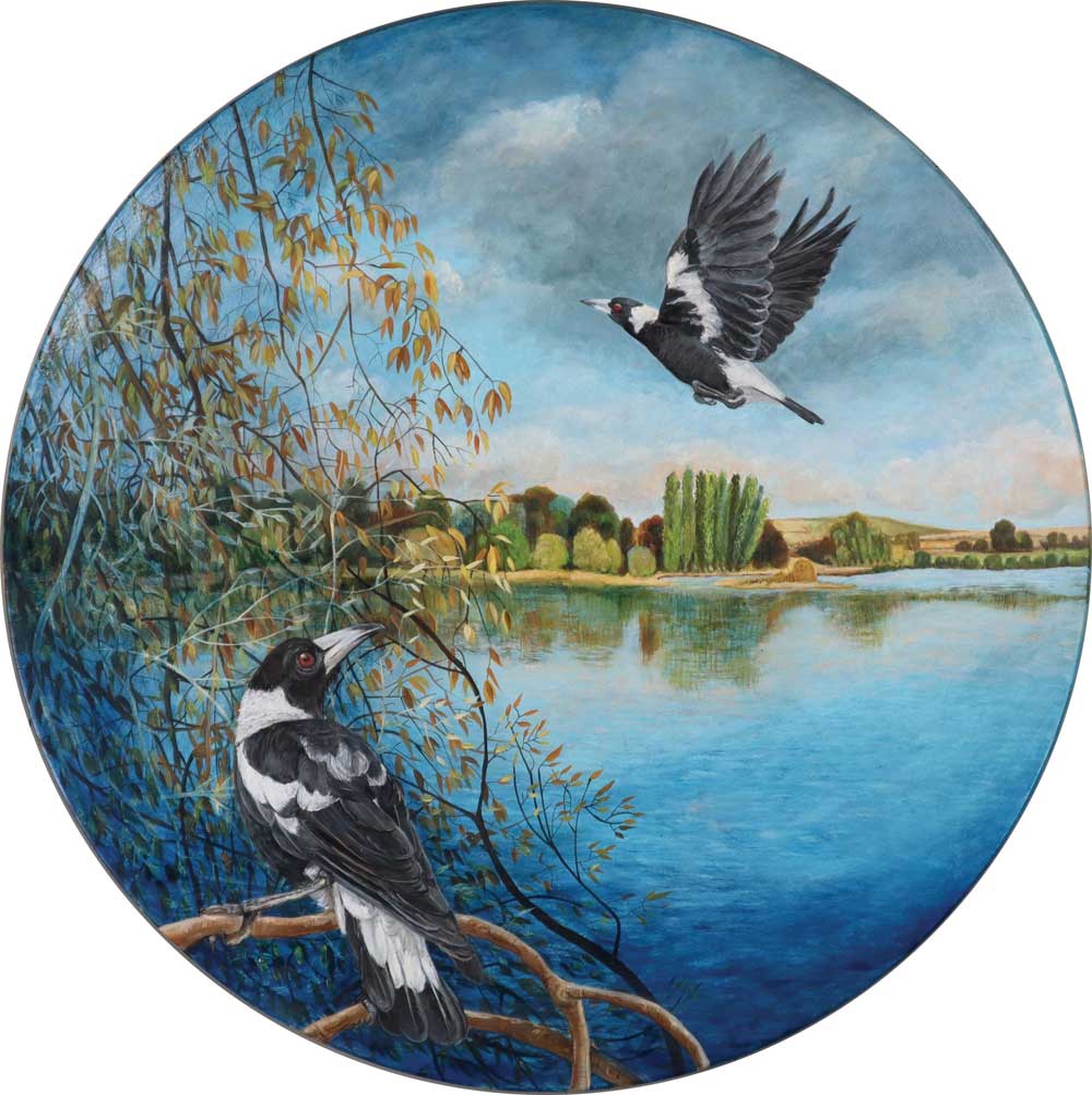 Canberra artist Dianne Fogwell is a highly accomplished printmaker and painter known for her luminous works inspired by the natural world. This exhibition, focusing on the importance of water, follows on from Dianne’s powerful bushfire-themed works over recent years. Inspired by “climatic shifts from fire to flood and ponderings about the significance of water to all life while wandering around the rivers, wetlands and lakes of the Canberra region,” these works capture waters’ regenerative powers of transformation, hope and renewal. Her works on paper, demonstrate her extraordinary relief printmaking skills as she creates dreamscape-like compositions through an intuitive building of layers. Each element of her composition is carefully arranged using a variety of intricately carved individual linocuts of trees and birdlife. These highly detailed images, often combined with soft metallic inks, create glittering luscious surfaces. Dianne’s delicately painted and richly detailed oil paintings, portray the unique characteristics of Canberra’s vibrant bird life. This superb exhibition seeks to draw attention to the intrinsic relationships that nurture our ecosystems whilst simultaneously being mindful of the danger that water can sometimes pose.