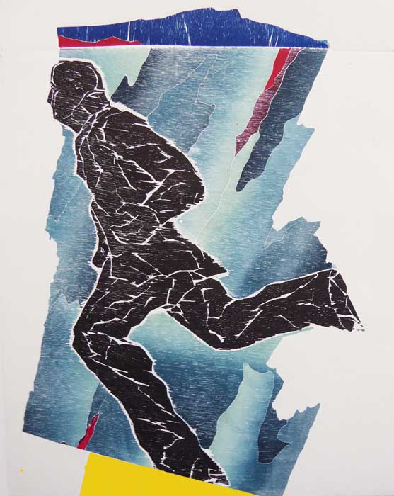 Canberra artist John Pratt has returned to an exploration of the human form in space in this exhibition “Street”. His recent works on paper combine layers of dynamic visual elements that surround the figure in motion within the urban precinct. As John explains, “The street zone was like a stage with a broad repertoire of movement and intent- walking, running, conveying, waiting, conversing. While the role of the pavement as a relaxed transit zone prevailed, there was also at times a certain sense of urgency, uncertainty and even ‘flight’.” John has played the role of a quiet observer to the frantic figures on the street and, in doing so, shows great empathy to their state of being – both physically and mentally. The intense energy in his art, where disparate elements of woodblock, collage and drawing work in unexpected harmony, convey the joy that John finds working in his chosen medium.