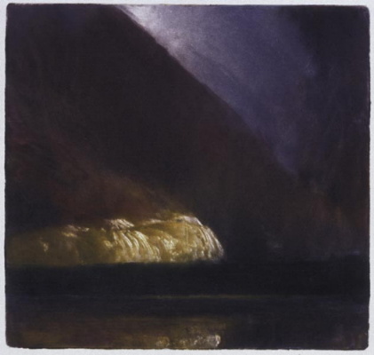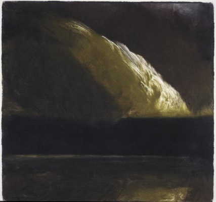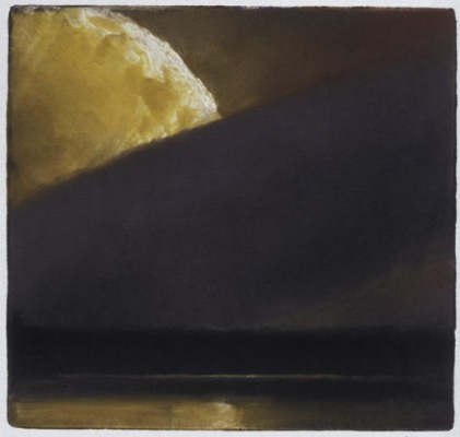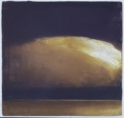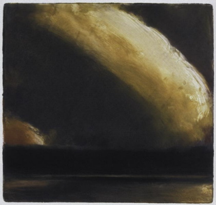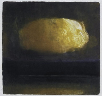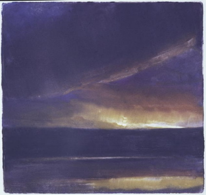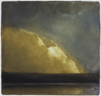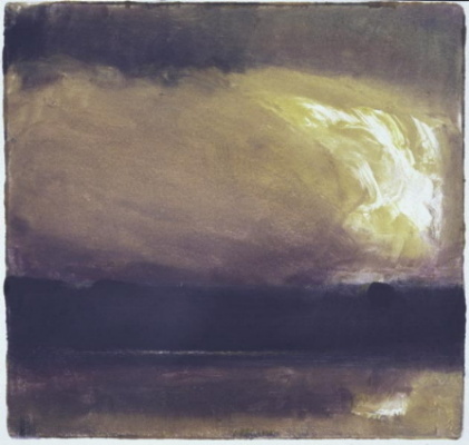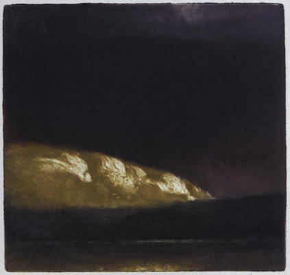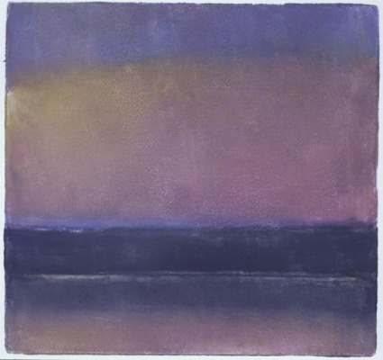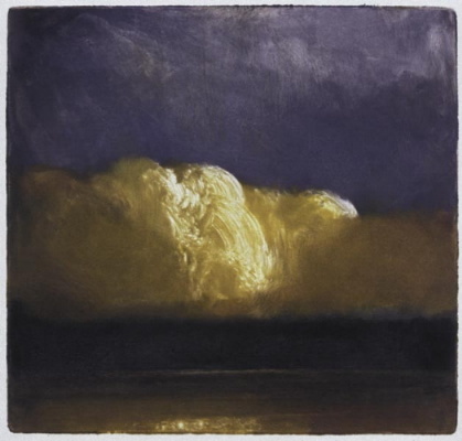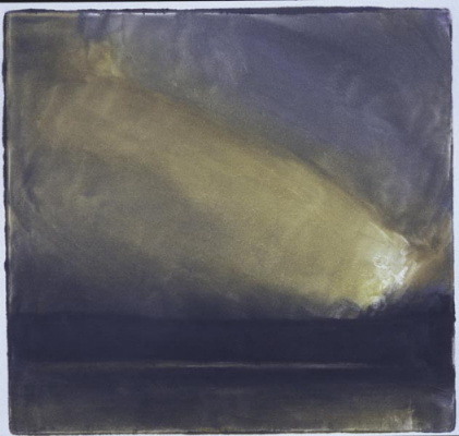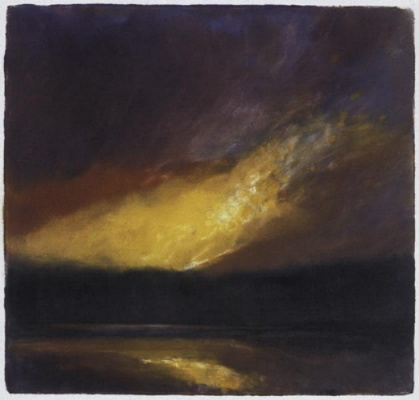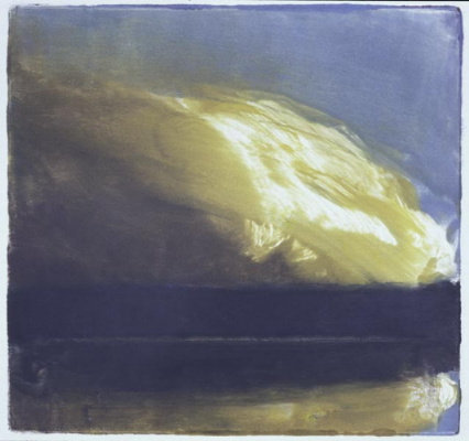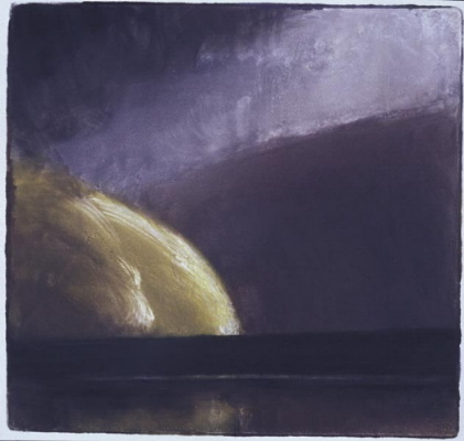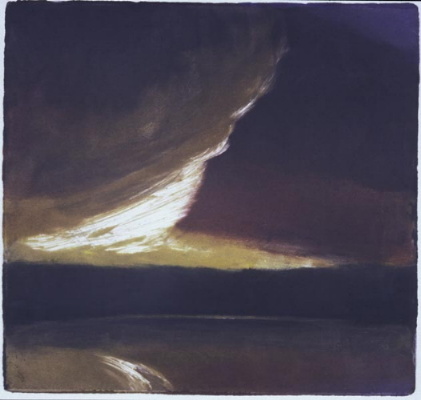 Glowing evening clouds and approaching storms feature in Wayne Viney’s haunting monotype prints. Although his work is classical in style, Wayne responds to nature in a real and immediate sense, translating unfolding atmospheric changes with rich colour and gestural movement. His extensive experience of experimenting with landscape and scale has led him to establish an expansive, painterly impact with smaller works. As the artist explains: “ ‘The Elements’ marks a change in my work. I have been gradually moving towards a simplified landscape format. In this instance ‘land’ is represented by a single, dark horizontal band. This has allowed me to concentrate on the elements above and below this band, ie, the sky and the water, where the drama of light, colour and movement is explored in endless combinations…the mood of these twenty one monotypes ranges from quiet contemplation, to dramatic effects of nature”. His work has been noted as romantic and Wayne acknowledges the English romantic masters – particularly Constable – as giving him the stimulus to create his unique work. The nature of the monotype printing process offers him a wonderful vehicle for improvisation, allowing for the rapid application of inks and paint, and also ensures that each print is absolutely unique. Wayne finds the technique of working in monotypes “both exhilarating and exhausting – an image will never look the way you expect when printed. This produces both frustrating disappointments and delightful surprises ”.