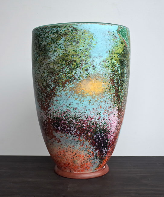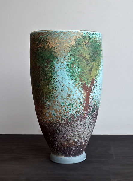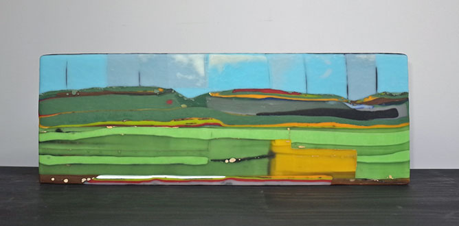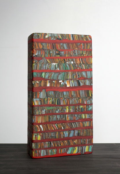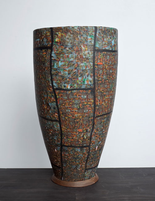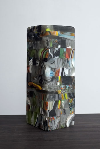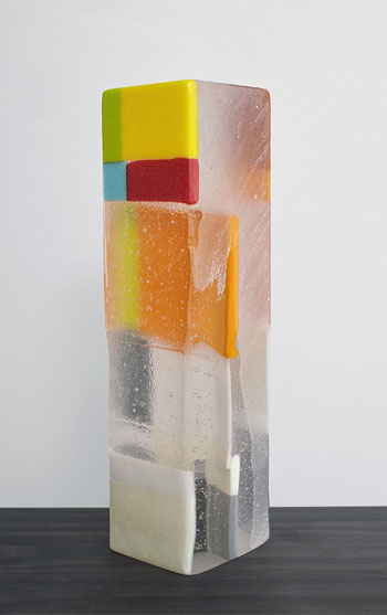 Brenden Scott French has a reputation as one of Australia’s most innovative and thought-provoking glass artists. His sculptural forms and wall pieces make a radical shift away from the delicacy and transparency of glass – instead they exhibit a unique density and opacity of colour. The striking pattern and form developed in the artworks reflect a deep exploration of this rich and versatile material. Brenden’s graphic panel works arise from a kilnforming process where blocks of coloured glass are composed in layers to form spontaneous, yet harmonious, colour relationships. He describes this act as “a labour of assemblage”, slowly revealing an unfolding narrative that celebrates the passage of time during the creation of the works. Complex visceral surfaces are built using the distinct technique of pâte de verre and murrine roll-up. Here, a panel is constructed using fused granules or cut rods of glass, giving Brenden the ability to generate subtle painterly qualities. Once heated, the sheets of glass can be rolled, blown and shaped to form intricate vessels. Brenden’s recent residency in the western ridge of the Barossa Valley, South Australia, brought inspiration for this new body of work, exploring both the external environment and his internal psychological narrative. Colour and form in the artworks play with ideas of the interior and exterior, organic and geometric, ultimately questioning our individual, as well as collective, relationship with the environment.