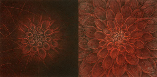 Chris Denton is known for his exquisitely detailed works on paper, which he describes as the “most beautiful and receptive of surfaces”. ‘white, red, black’ encapsulates the trajectory of the artist’s practice, boldly introducing minimal fields that contrast with his iconic motif, the dahlia flower. Both the drawings and prints in this exhibition involve a process of sequential layering in their making, creating their striking depth of colour and luscious surface. The prints achieve further sequencing with each plate often reworked to provide a number of states. The lone motif in this exhibition, an exquisite dahlia, emphasises beauty found in the underlying laws of nature. Chris’s immaculate representation contrasts strikingly against fields of apparent nothingness but this ‘void’ is actually filled with complex layers of detail, a meditation on the philosophical concept of empty space.Chris comments that the artwork in this exhibition is endowed with meaning through his continued“interest in the natural order, but also aims to provide the audience with a universal narrative, as the minimal fields and the dahlia move between one state and another.”